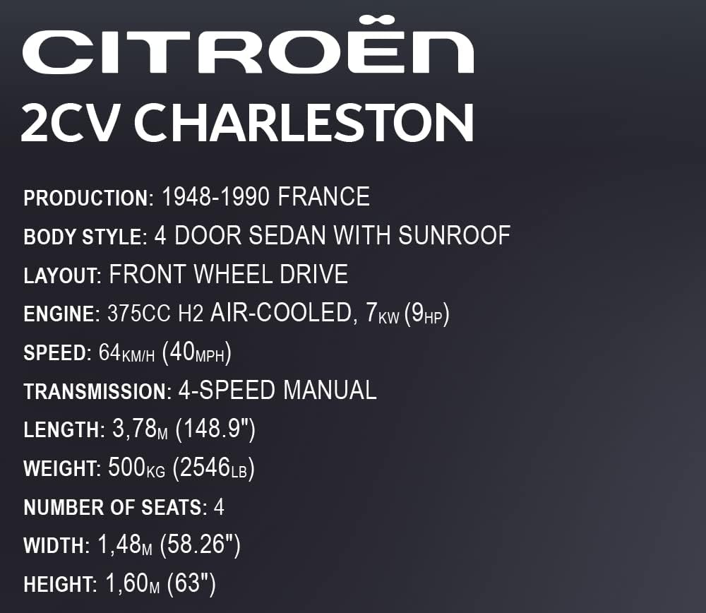 De Citroën 2CV Charleston is een van de meest herkenbare uitvoeringen van de legendarische “Eend”, bekend om zijn retro uitstraling en comfort. Deze set is ontworpen voor liefhebbers van klassieke auto’s en biedt een uitdagende en plezierige bouwervaring met een indrukwekkend eindresultaat.