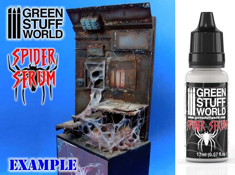 Green Stuff World’s Spider Serum is geen echt serum voor spinnen. Het is een speciaal ontwikkeld toevoegingsproduct voor verf waarmee je realistische spinnenwebben en webben kunt creëren op miniaturen en scenery die worden gebruikt in hobby’s zoals: