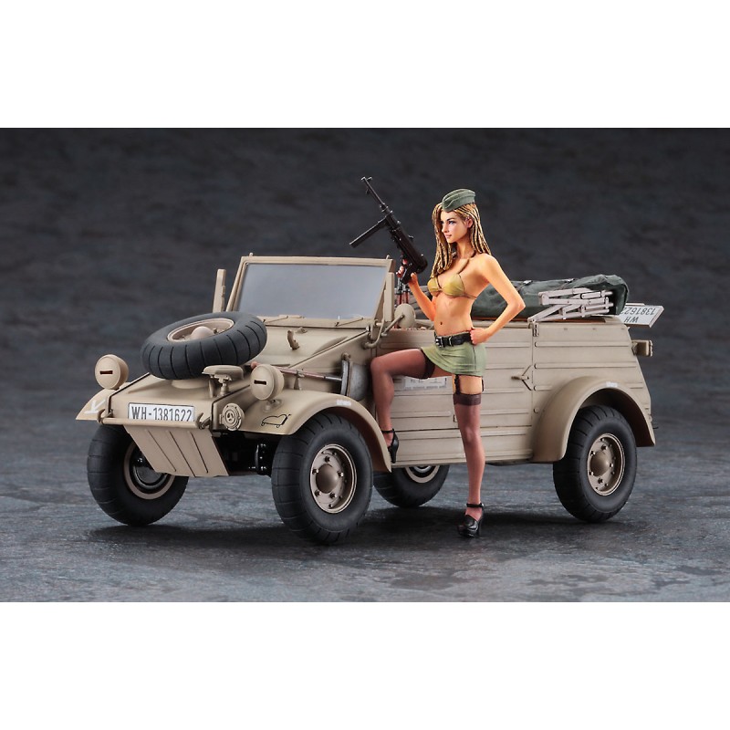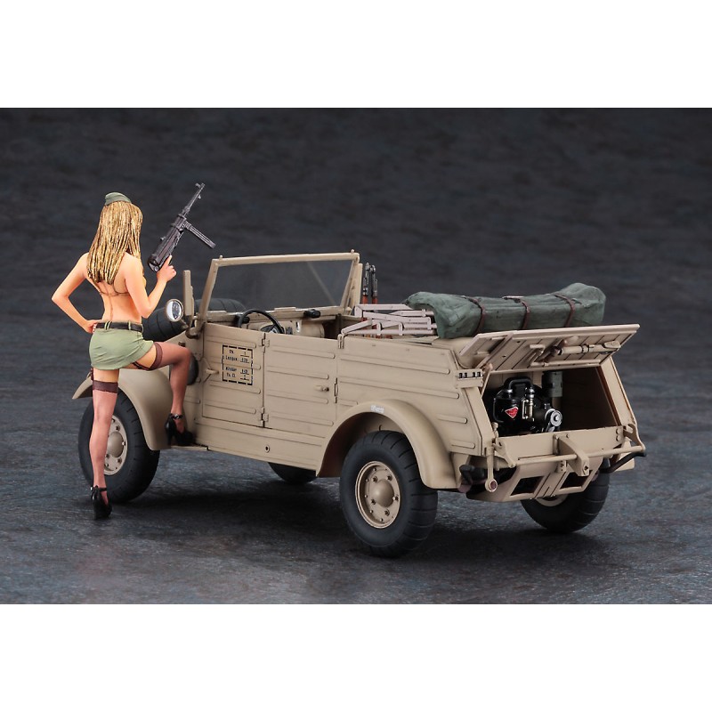 Deze bouwdoos in schaal 1:24 van Hasegawa brengt de legendarische Kübelwagen tot leven, inclusief een vrouwenfiguur in uniform voor een uniek diorama-thema.