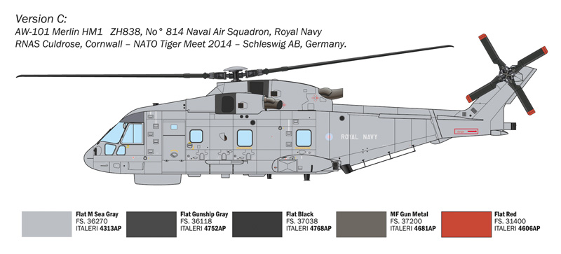 De kit bevat decals voor meerdere Royal Navy‑versies van de Merlin HM.1