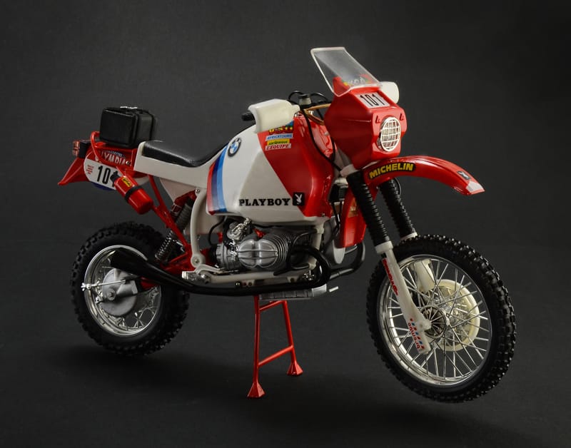 - Design: Het model heeft het iconische BMW Motorsport kleurenschema (blauw, paars en rood) en een oversized 32-liter brandstoftank zoals gebruikt in de echte rallymotorfiets.