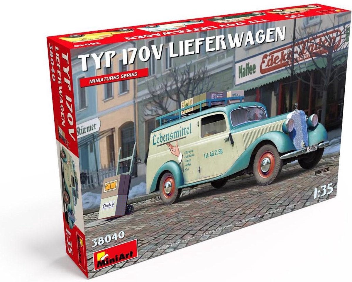 De MiniArt 1:35 Typ 170V Lieferwagen is een modelbouwkit van een Duitse bestelwagen, de Typ 170V Lieferwagen, uit de jaren 30 en 40 van de 20e eeuw. Deze bestelwagen werd geproduceerd door Mercedes-Benz en werd gebruikt voor verschillende transport- en bezorgtaken. De Typ 170V Lieferwagen was een robuuste en betrouwbare bestelwagen met een laadruimte aan de achterkant, waardoor het geschikt was voor het vervoeren van goederen en ladingen. Het werd aangedreven door een efficiënte motor en had een eenvoudig maar praktisch ontwerp. Photo etch onderdelen, decals voor 4 versies en kar plus kartonnen dozen inbegrepen!