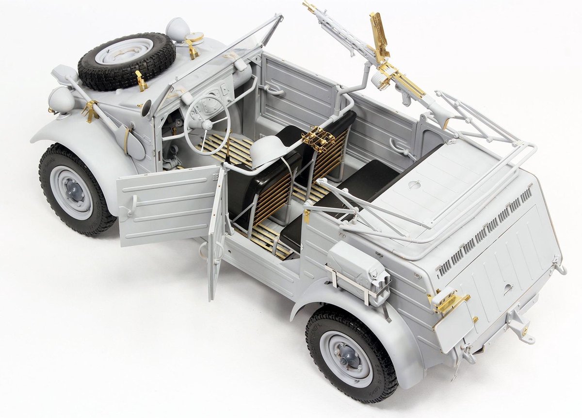 De grote schaal van 1: 9 maakt al een zeer hoge detaillering van de Kübelwag-detaillering van de Kübelwagen mogelijk, die verder kan worden verbeterd met de foto-geëtste onderdelen die in de kit zitten. inbegrepen in de kit.